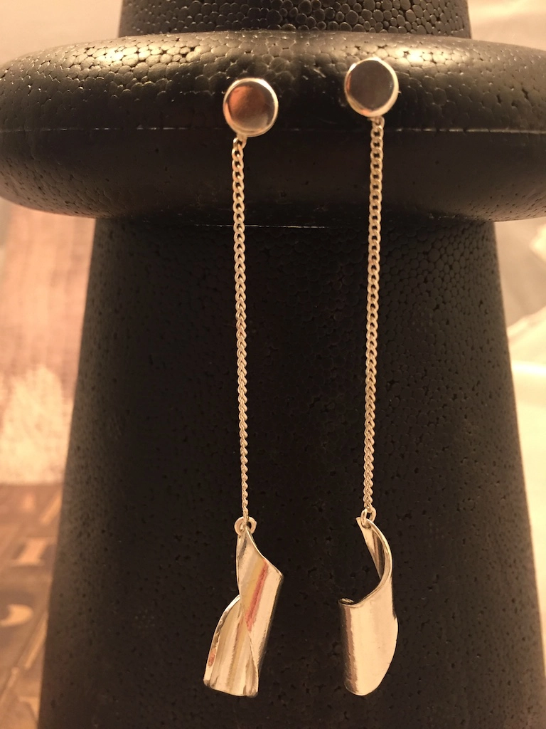 Jolies boucles d'oreilles longues avec tourbillon au bout de la chaîne.